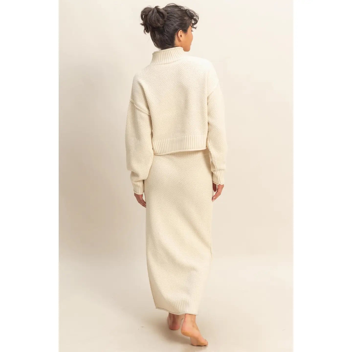 This coordinated set features a textured high-neck sweater and a matching long skirt that offers both comfort and style. Its relaxed fit is ideal for layering, making it perfect for chilly days or casual evenings. Pair with minimal jewelry and loafers for a polished look. The versatility ensures it can transition from office to outings effortlessly.
