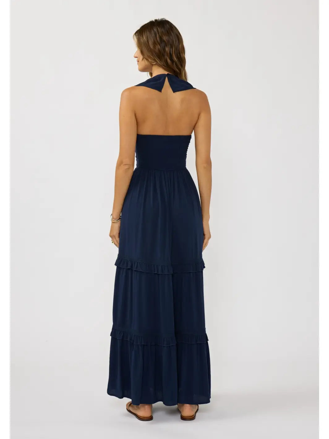 A flowy bohemian maxi dress featuring soft ruffle trims.
