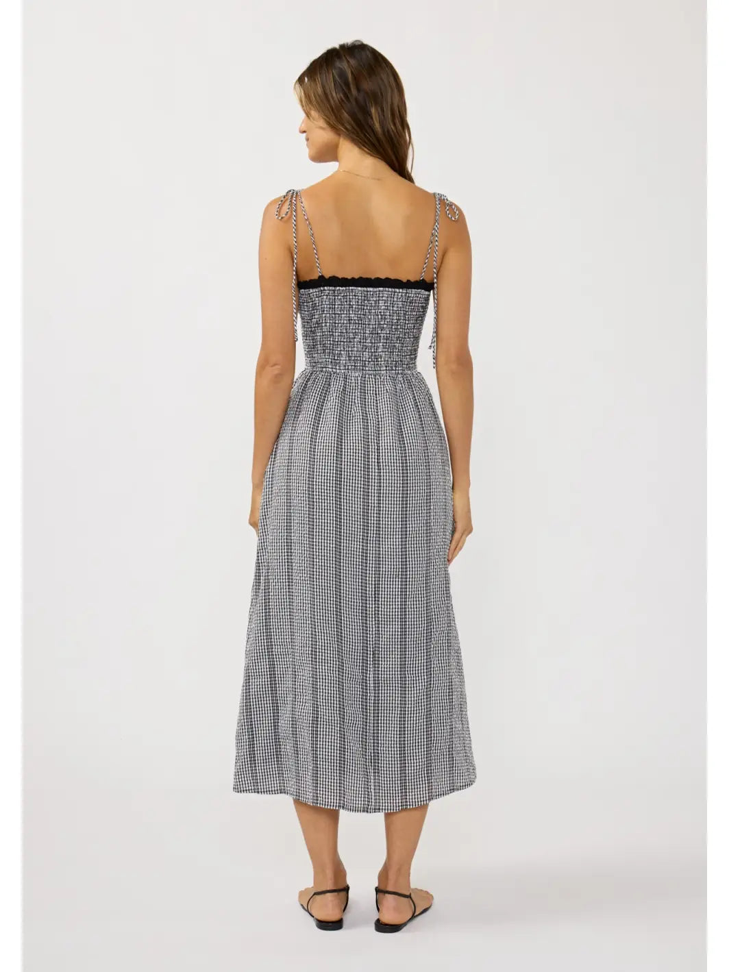 Light and charming, this gingham midi dress features a soft V neckline, delicate spaghetti straps, and a fully smocked bodice that creates a comfortable, flattering fit. Finished with a flowy skirt and subtle scallop lace accents for a sweet, timeless look.